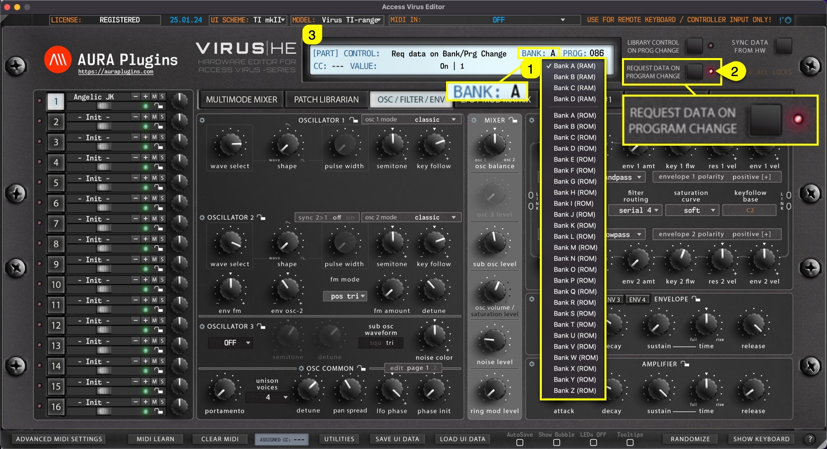 If your model is set to Virus TI, bank menu does not have as many options as when Virus C is set as a current model. This is because Virus TI has a bigger memory capacity. When REQUEST DATA ON PROGRAM CHANGE [2] is toggled on, this popup menu will display bank numbers available to browse. See image below.