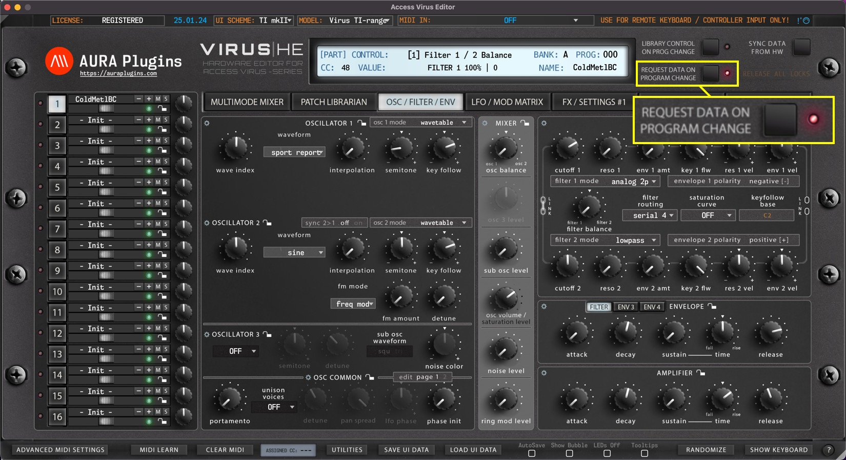 REQUEST DATA ON PROGRAM CHANGE means that if the Editor receives program and/or bank change message from MIDI input, our Editor will initiate Data request from the Virus to the Editor user interface.