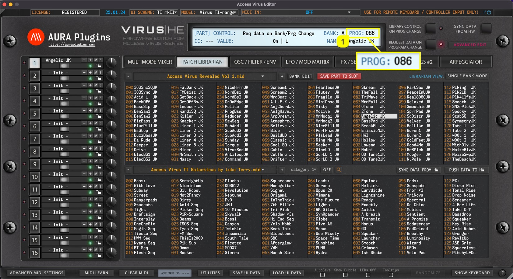 PROG Display [1] acts as a menu as well as a display to show the current Part Patch program number. You can quickly navigate to different banks of programs without having to click Program Change buttons like crazy.