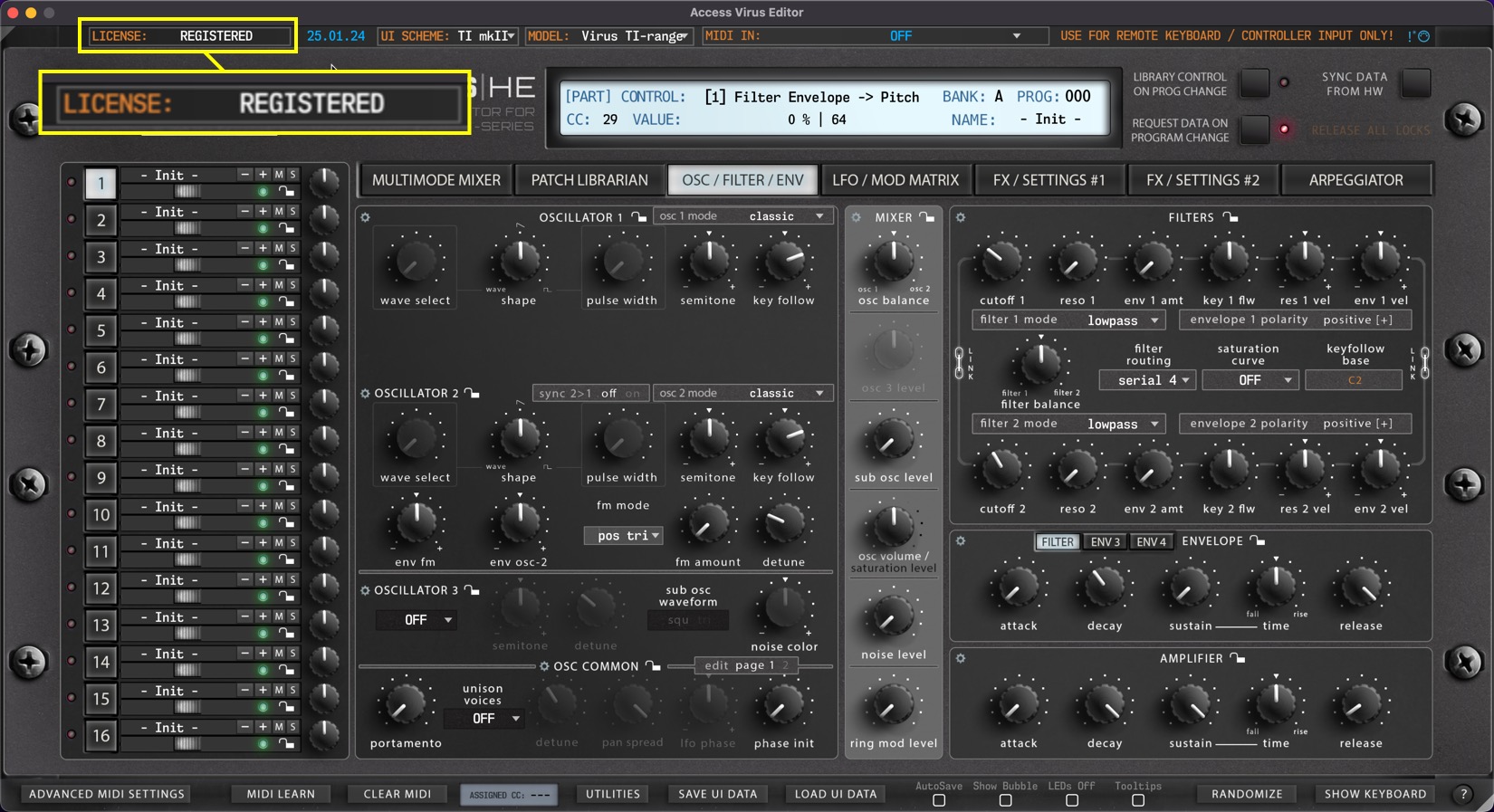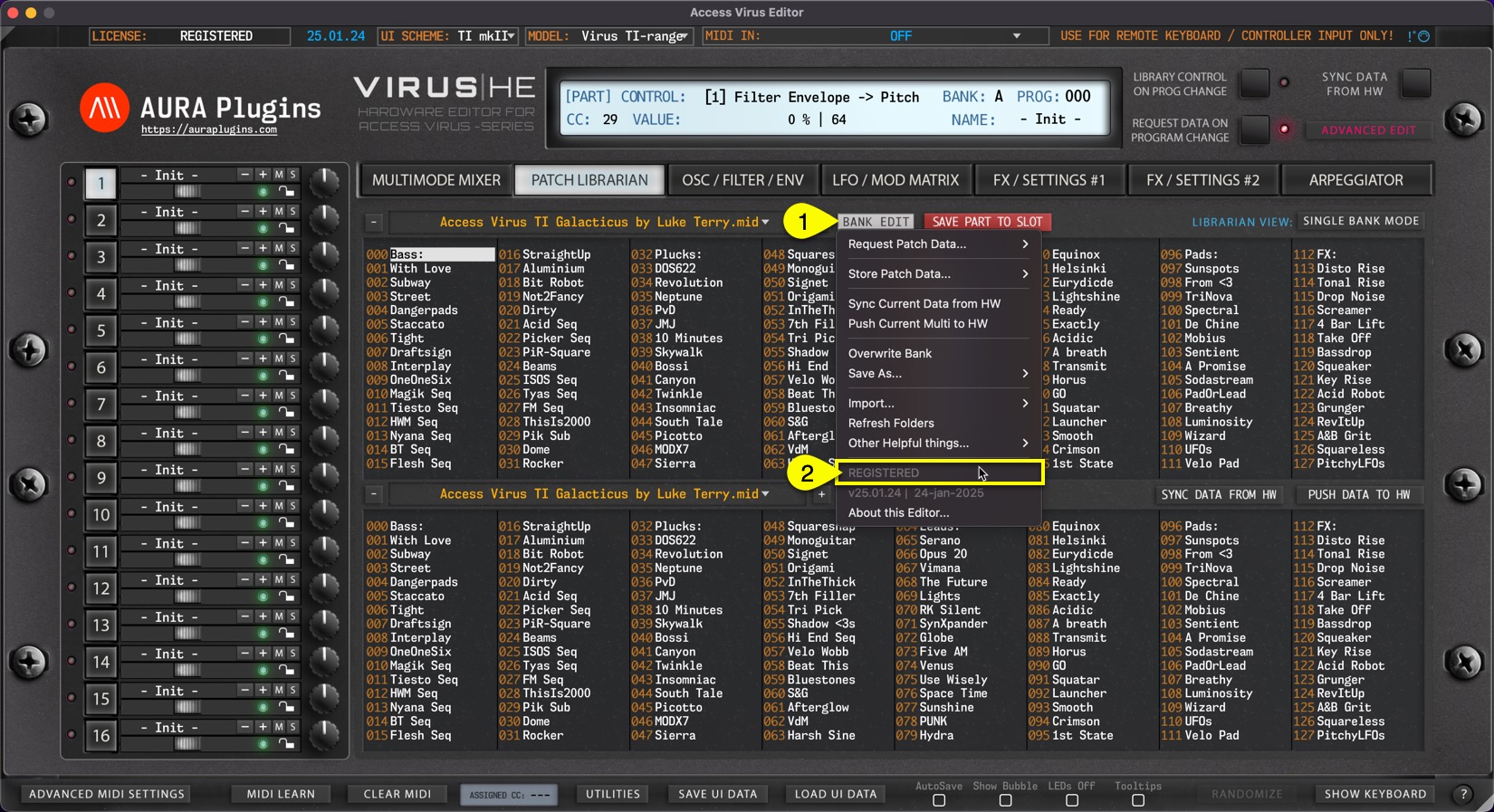 Editor license status is also shown in PATCH LIBRARIAN tab if you click Bank Edit [1] menu. Status [2] is shown here.