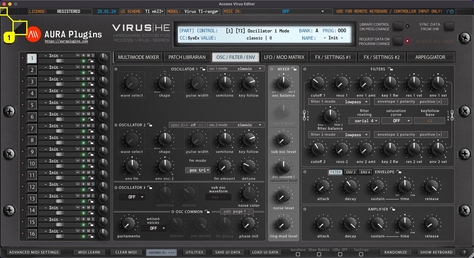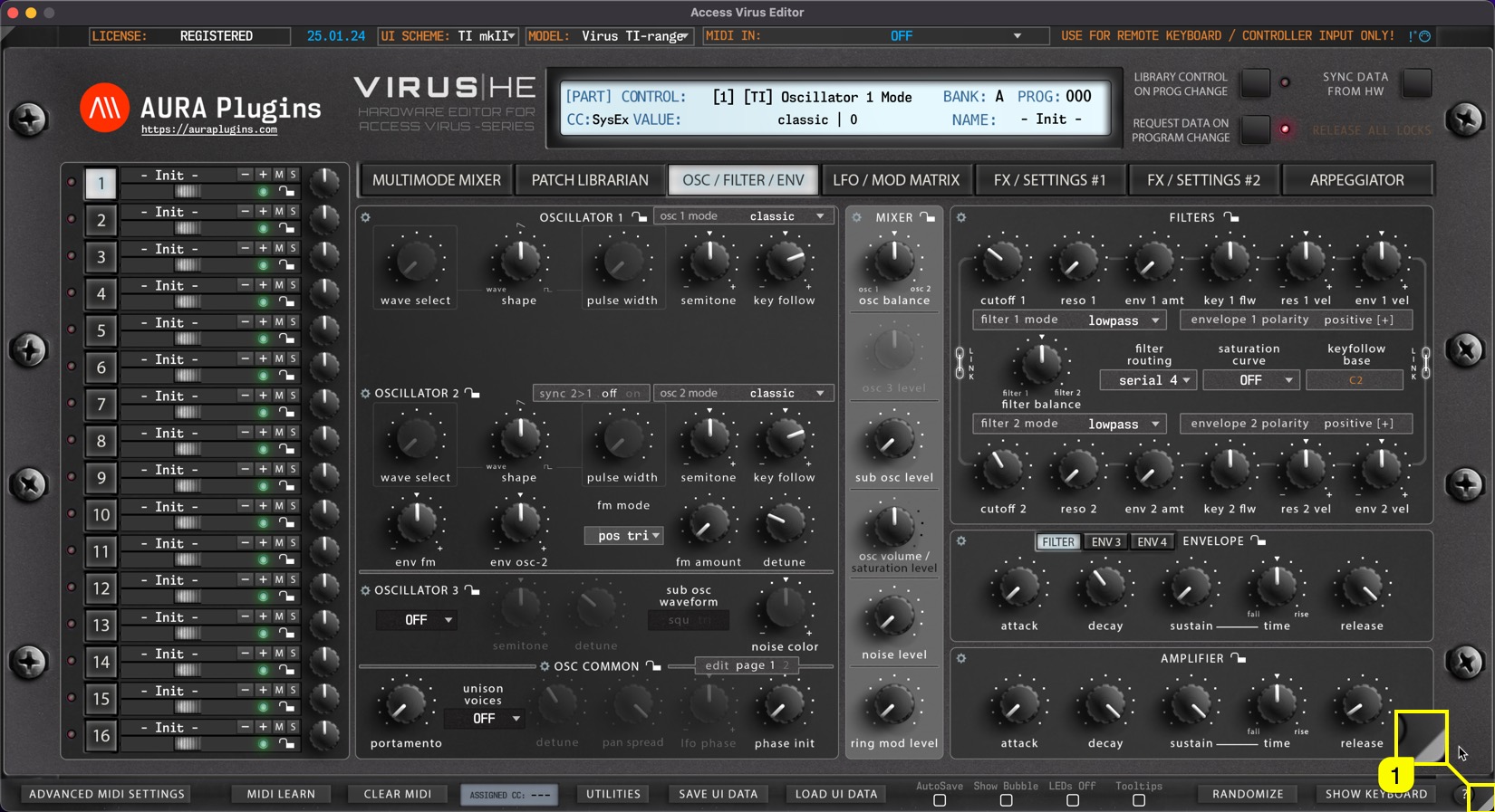 You can resize the Editor user interface in real time by clicking and dragging the white triangle [1] in the bottom right corner. Double click will revert the scaling level back to 100%. This setting is saved with DAW project data, but Standalone Application always reverts to “zero” resize stage when Application is launched again.