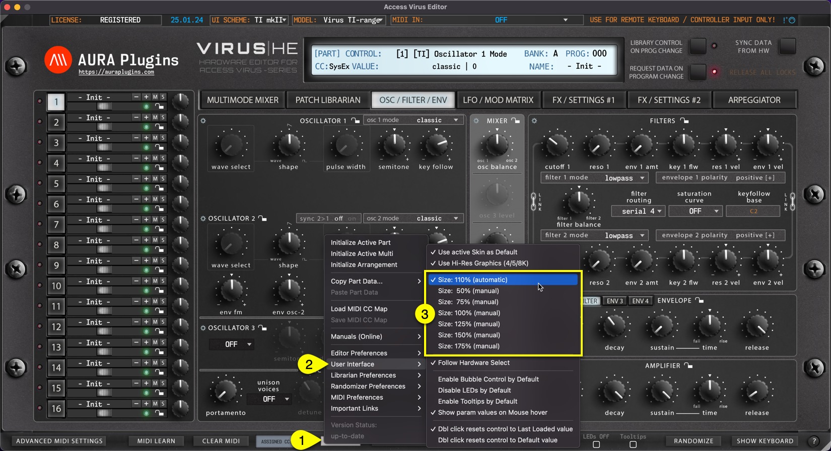 You can also set “default” scaling level by opening Utilities [1] menu -> User Interface [2] and selecting the size [3] that fits your setup the best.