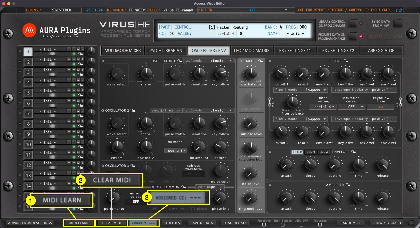 MIDI LEARN [1] allows you to map incoming MIDI CC control message to certain controls of the Editor.