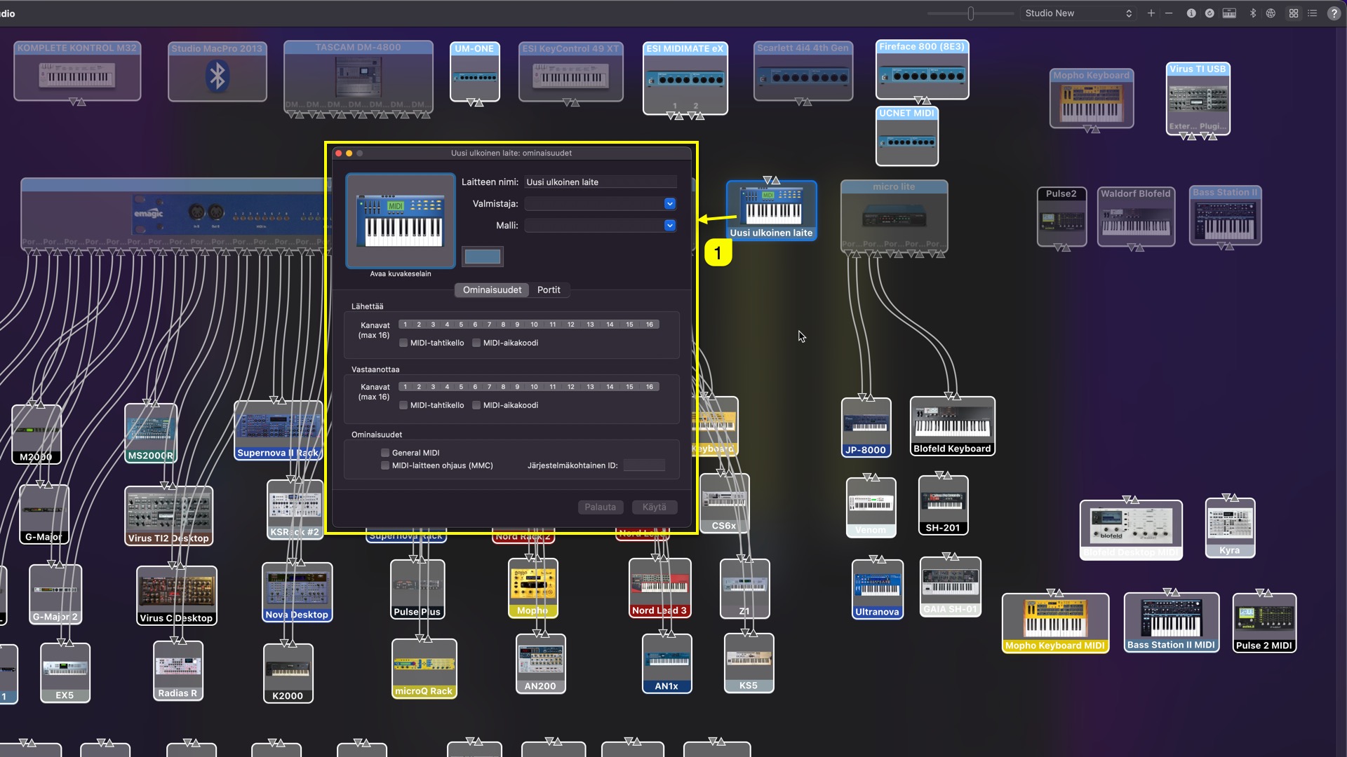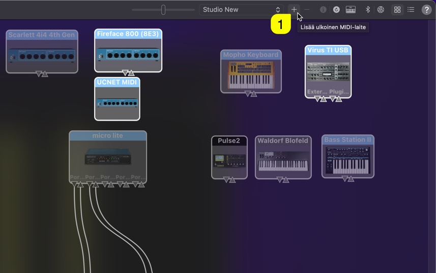 Click + -sign [1] from the top right corner (add external midi-device)