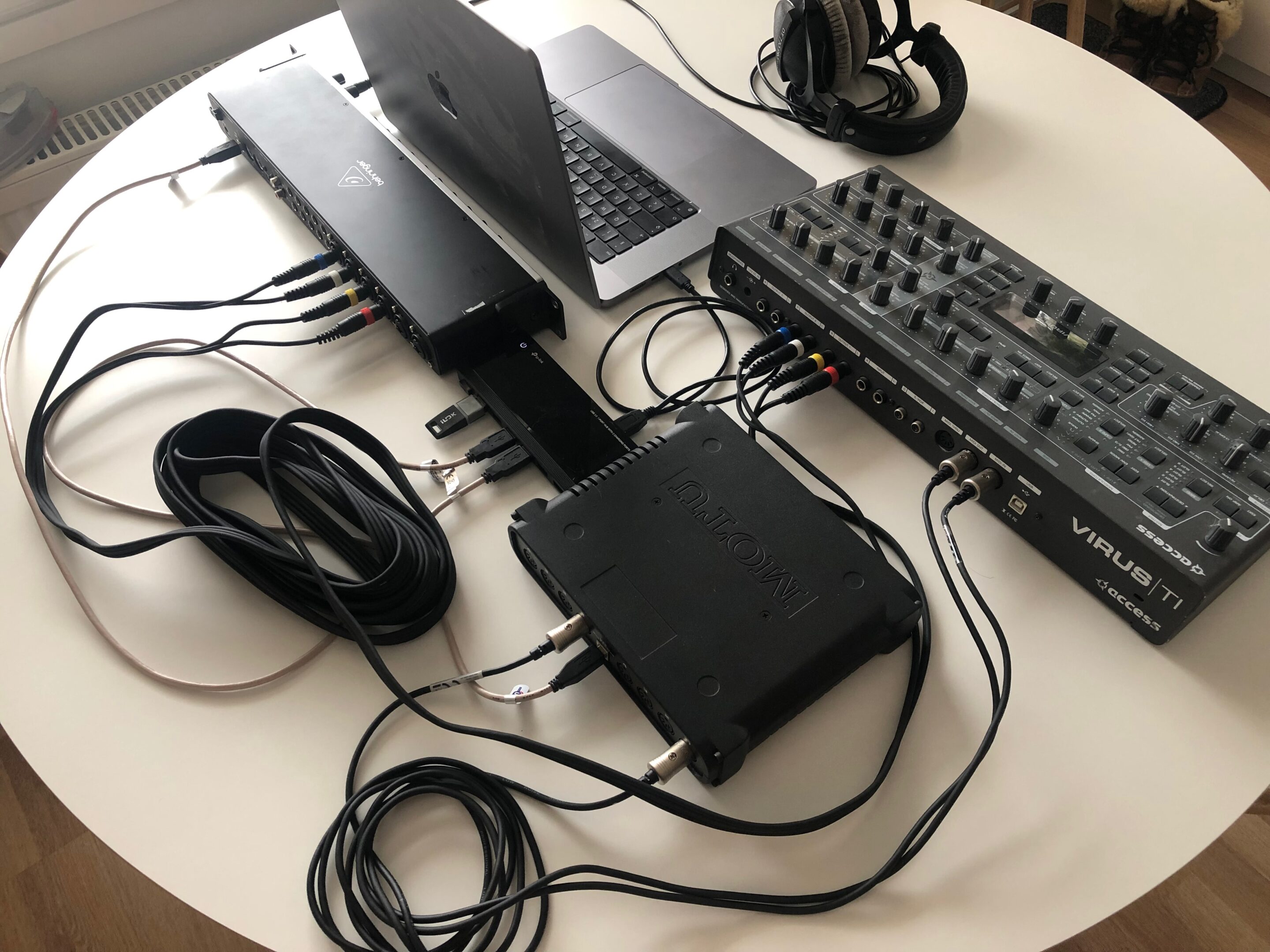 In the sample below, you can see how simple setup works with minimal effort. USB from Virus TI is connected to USB 3 hub. This hub is then connected to Apple Silicon mac with USB-C cable. Audio and MIDI is passed to and from Virus TI with the single USB cable.