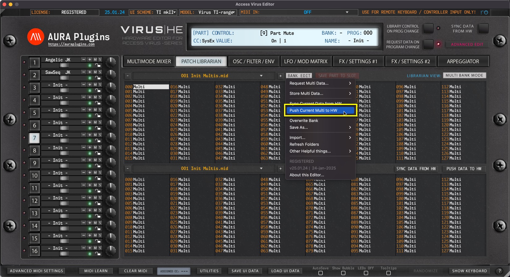 NOTE: With Push Current Data to HW function you can recover your User Interface data back to your Hardware in case your MIDI interface ports are different to previously set ports!