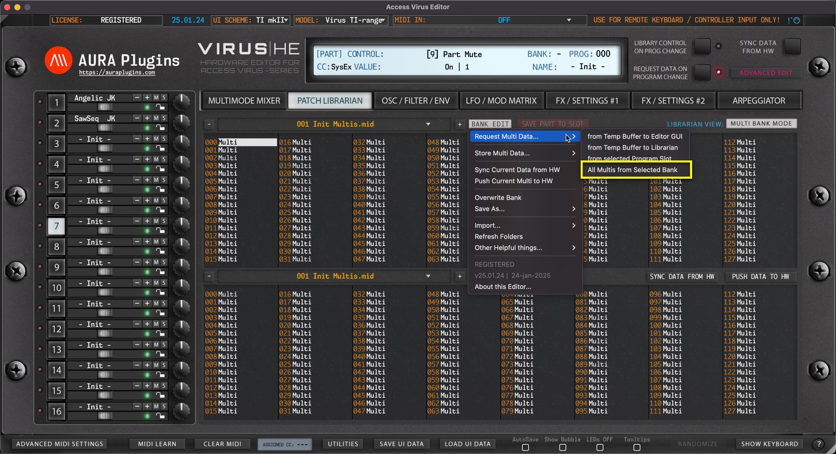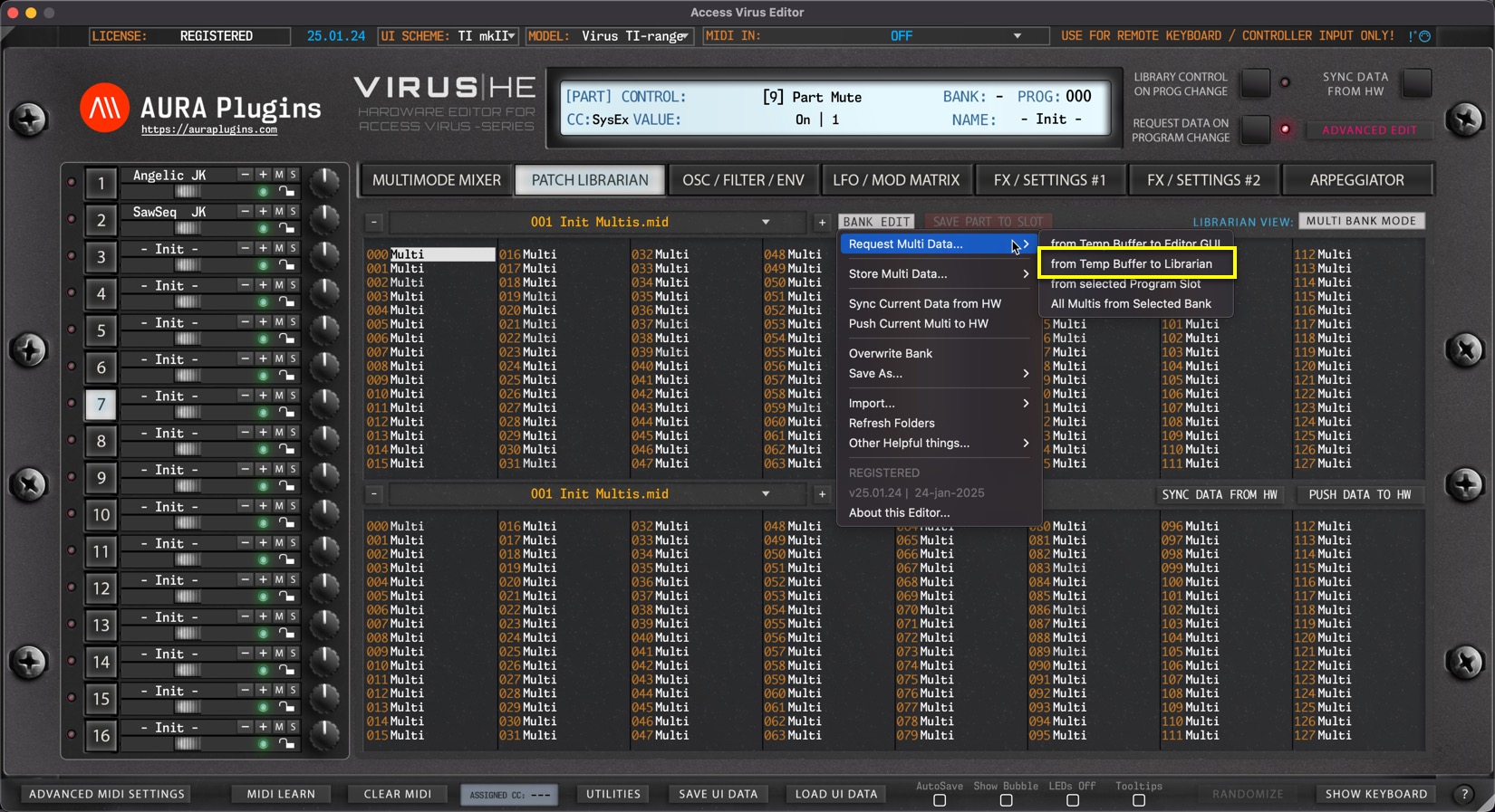 Open BANK EDIT menu and choose Request Multi Data … -> from Temp Buffer to Editor GUI to get the buffer data from the Hardware to the Editor User Interface. This action will request multi data and individual parts.