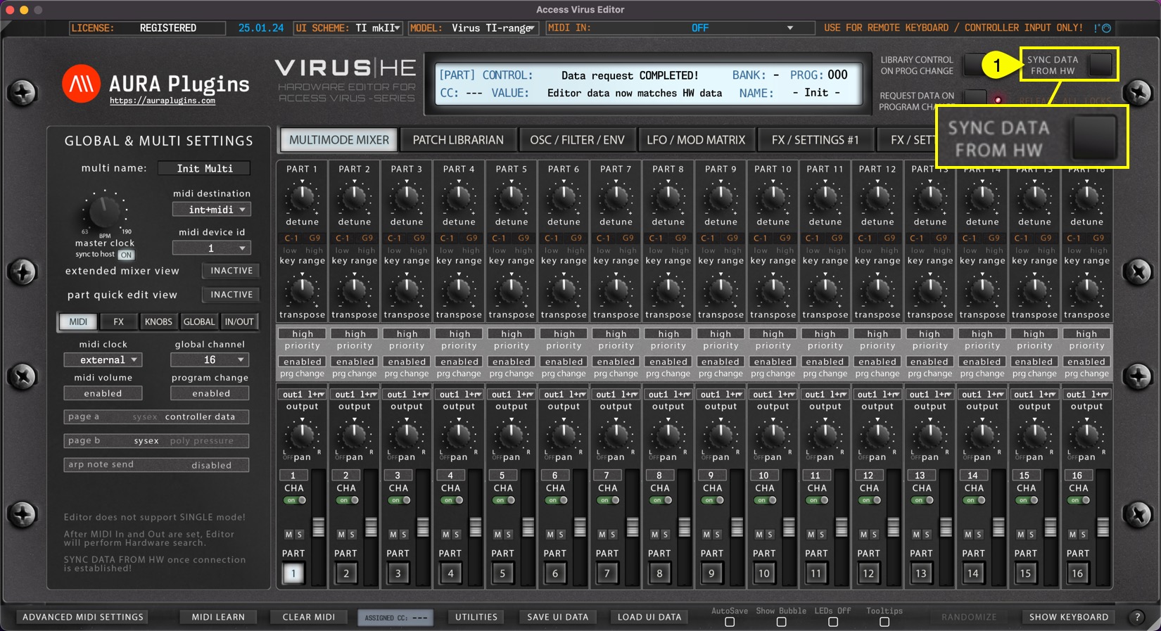 This is the final step before you can start making your own adjustments IF “Enable Hardware Auto-connect” is disabled from Utilities menu as explained in previous section! Click Sync Data From HW [1] button to synchronize active MULTI data and individual PARTS from your Virus to the Editor user interface. This needs to be done only when new instance is loaded so that the Editor and you know what was set in the hardware already.