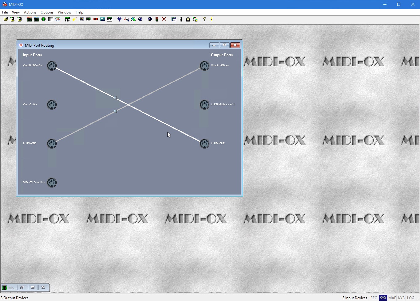 This will allow us to clone the MIDI data from the physical MIDI interface ports to virtual ports and then later on route it inside MIDI-OX back to your DAW while the main port is assigned to the plug-in.