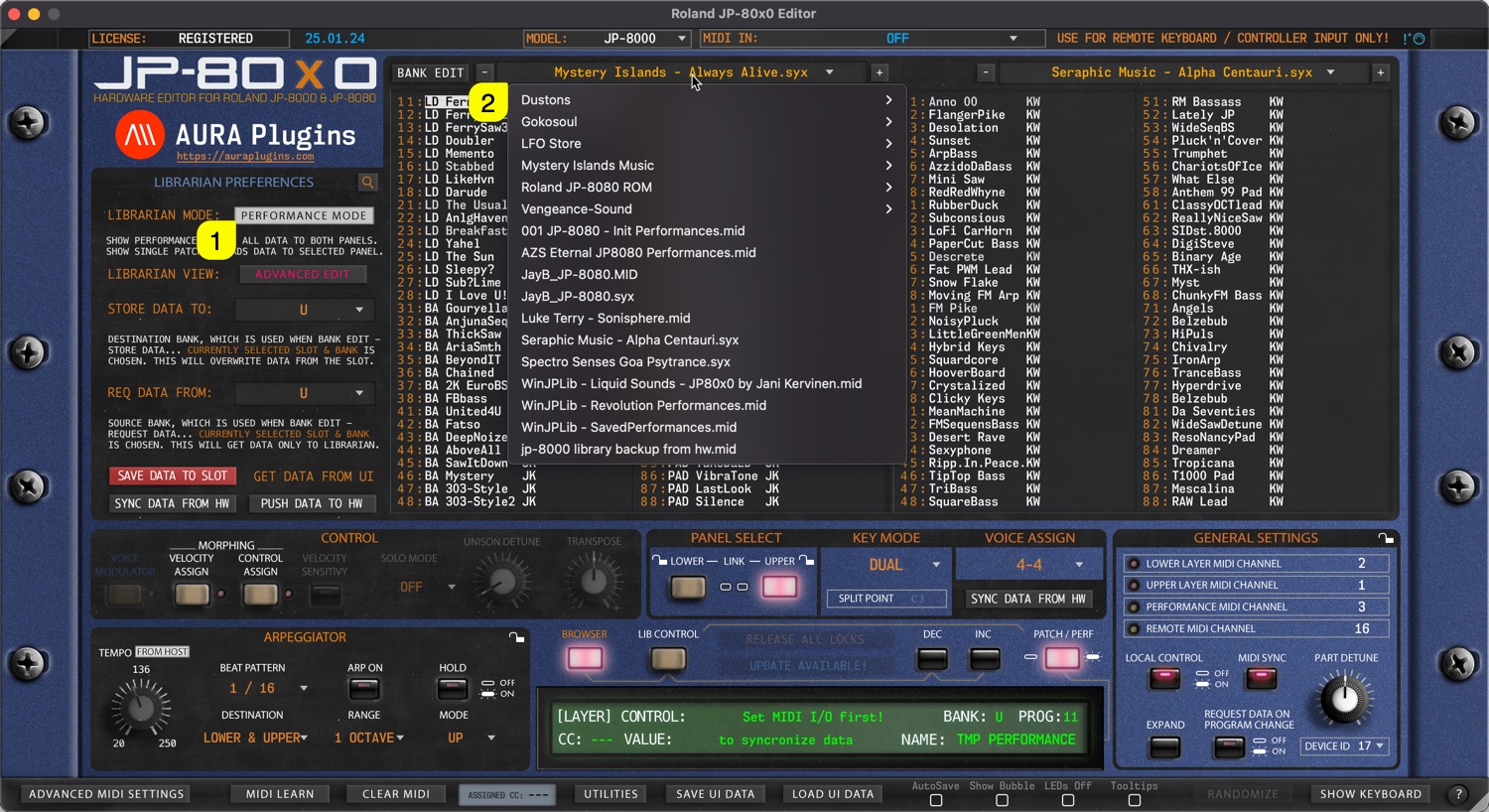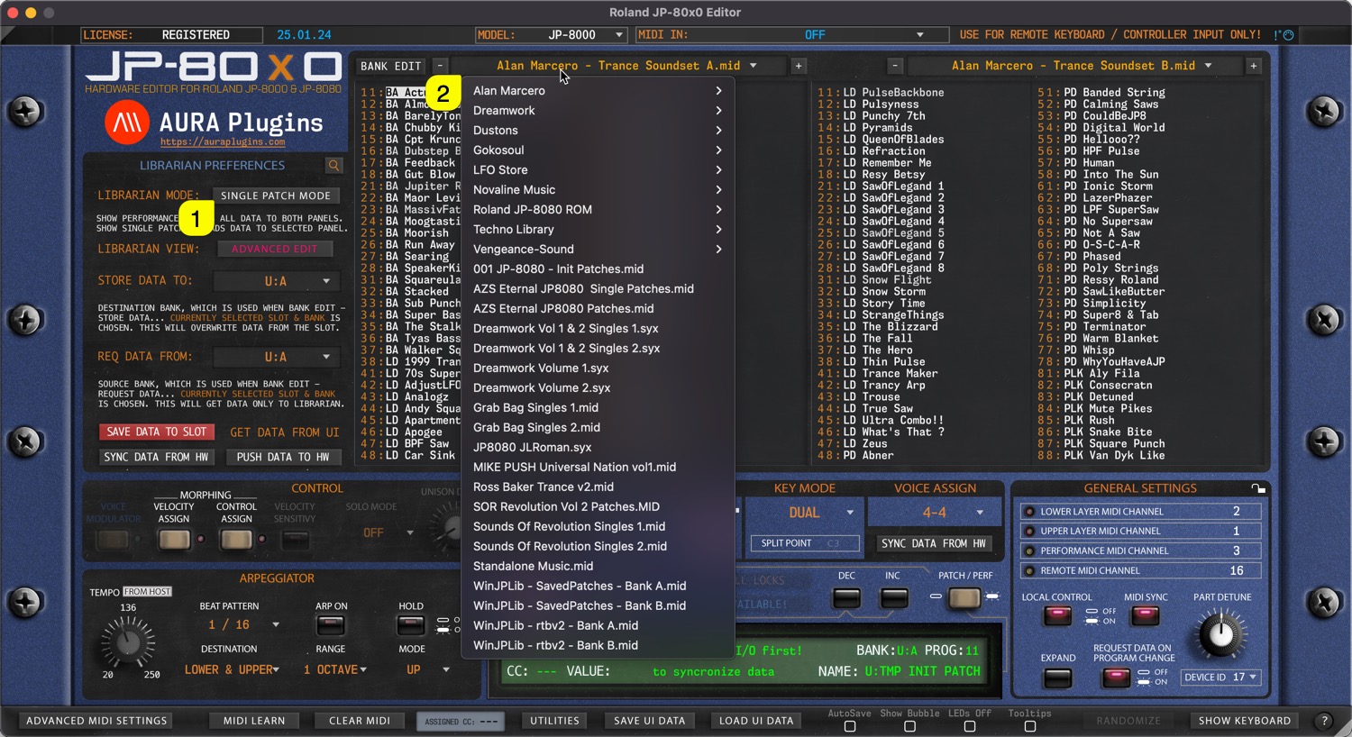When SINGLE PATCH MODE [1] is selected, use can open a drop down menu by clicking the bank name [2] area with mouse click. With this drop down list, user can see all of the availabe banks detected by the Editor.