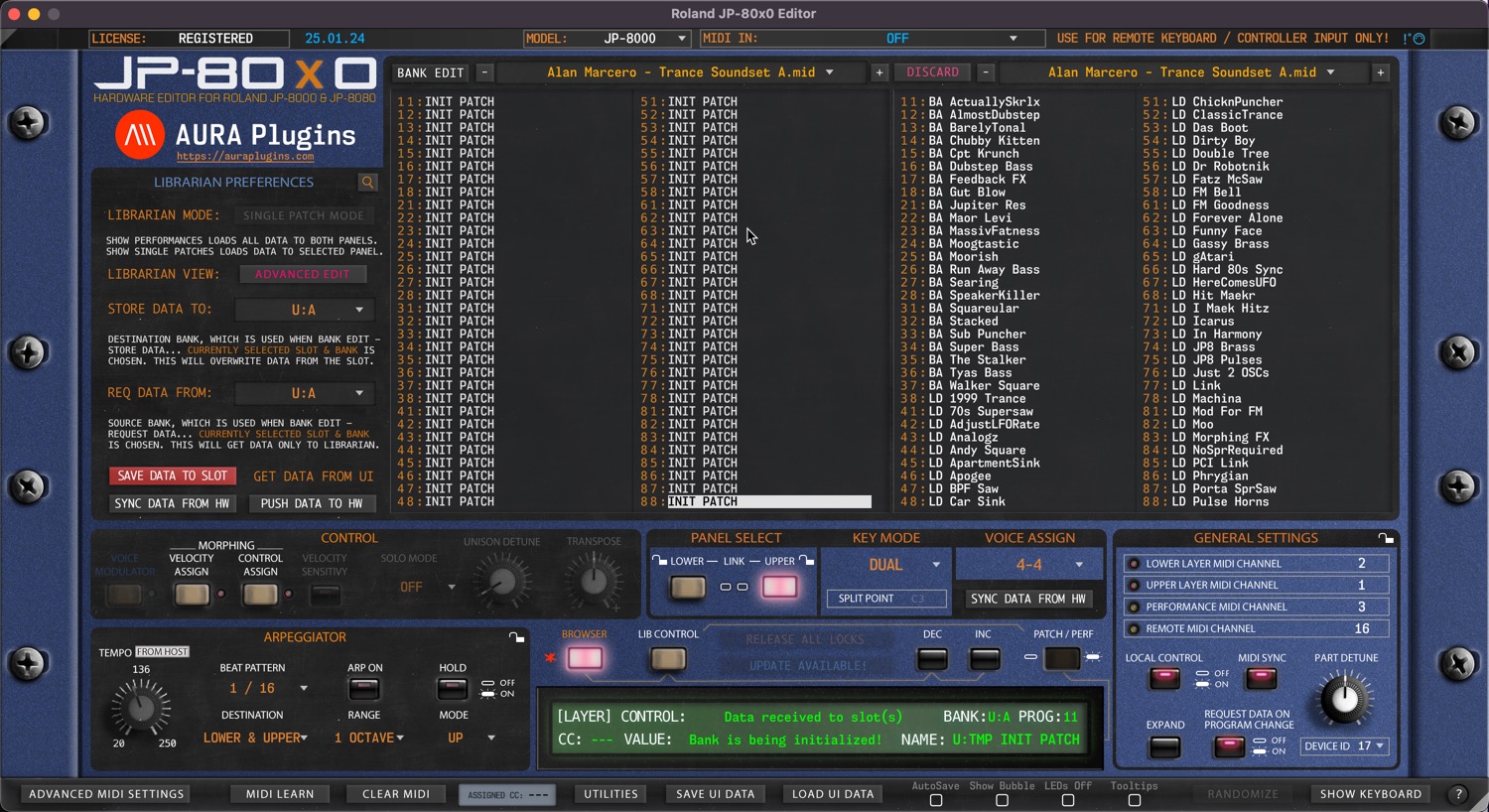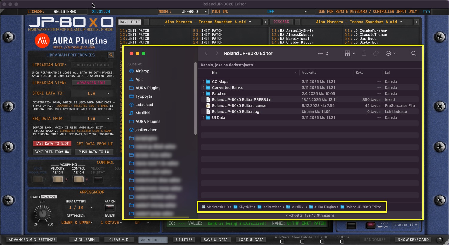 Open BANK EDIT menu and choose Other Helpful things … -> Open Data Folder to open the root folder for the Roland JP-80×0 Editor. In this folder you can find your license file, LOG file, PREFERENCES file and folders for UI DATA and PATCHES.