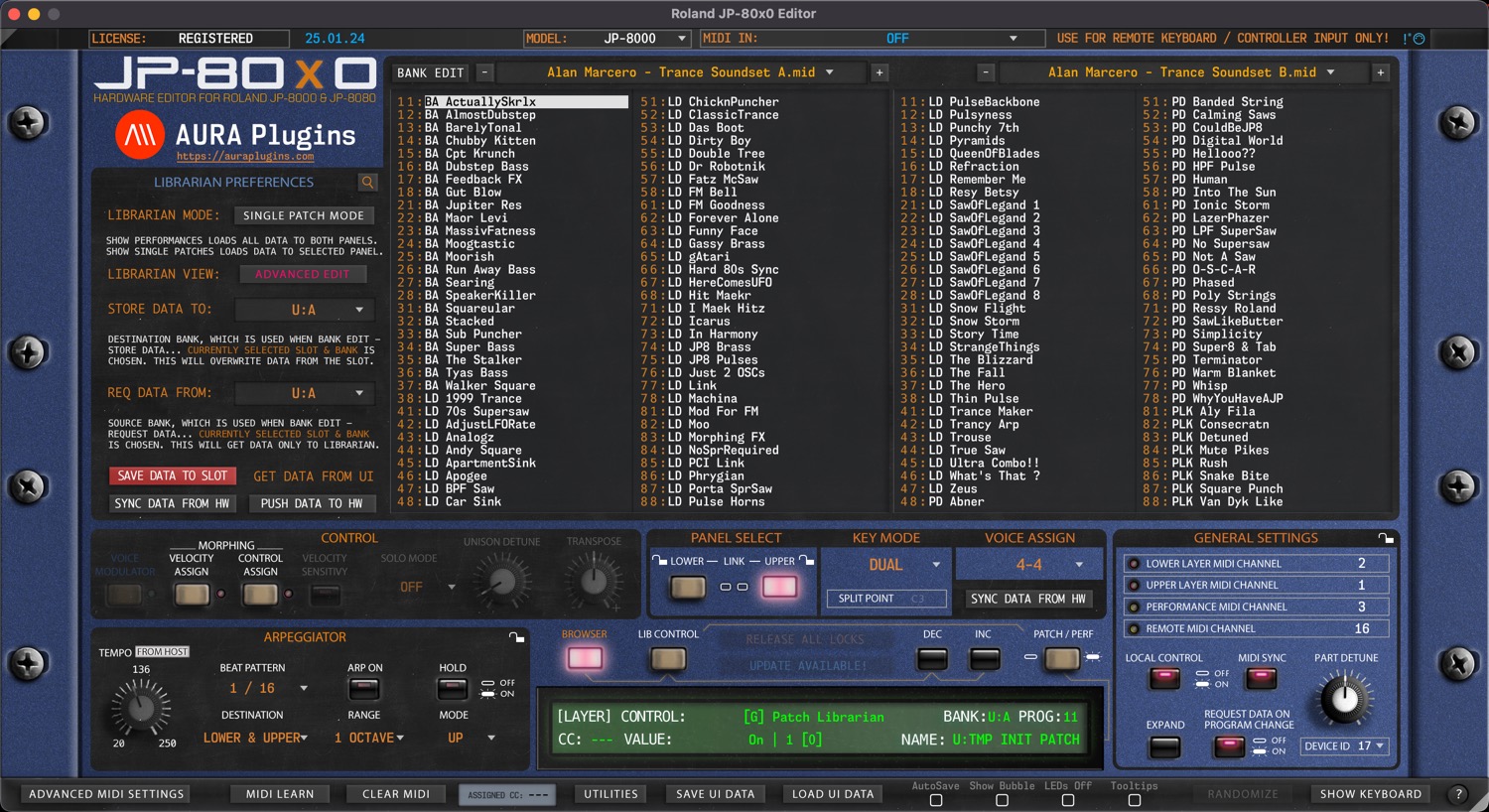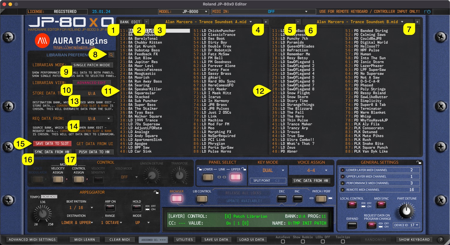 NOTE: Librarian view is not synchronized with hardware memory. Librarian view displays SINGLE or PERFORMANCE data stored in your HDD ( [data folder]/Patches/ -folder ).