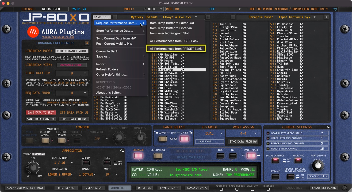 This action will request all PRESET bank Performances to the Librarian from your hardware.