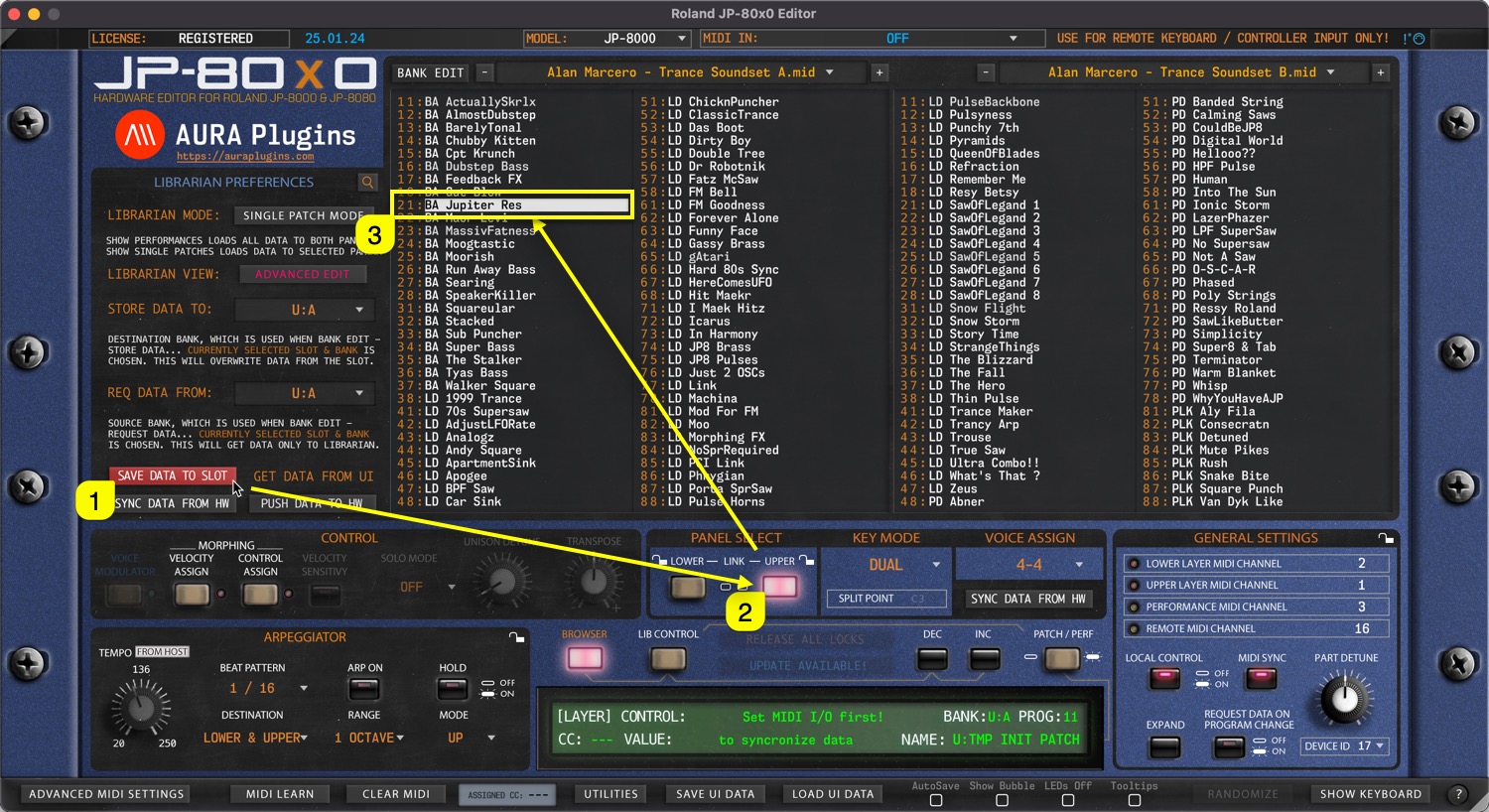 In this case we click the Save Data To Slot [1] button while UPPER [2] layer is selected. This will then get Editor data from UPPER slot and place it into Librarian slot 21 [3] which is currently selected.