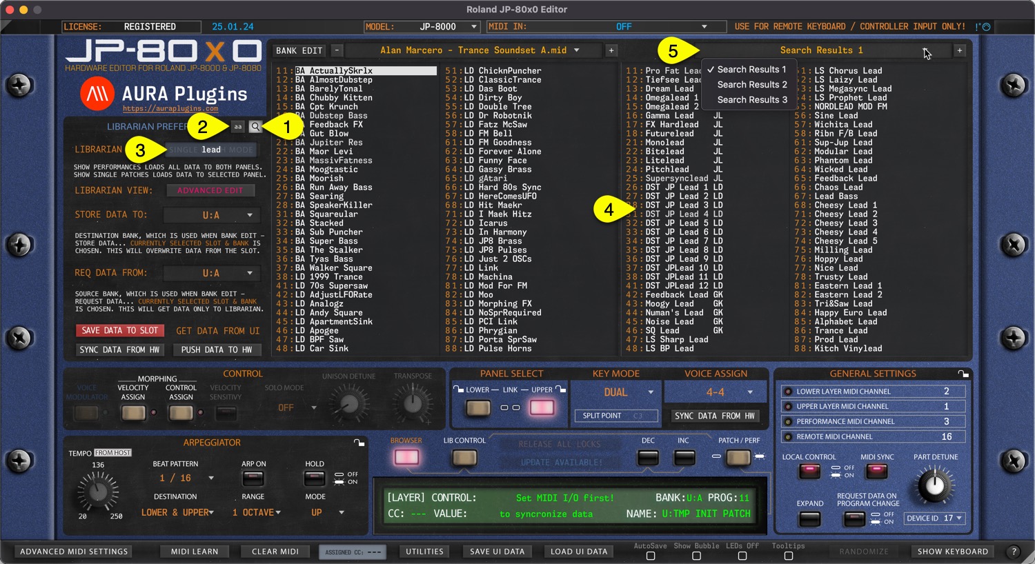 Search follows the current Librarian View mode, ie. PATCH mode shows results only from Patch banks, while Performance mode shows only results from Performance banks.