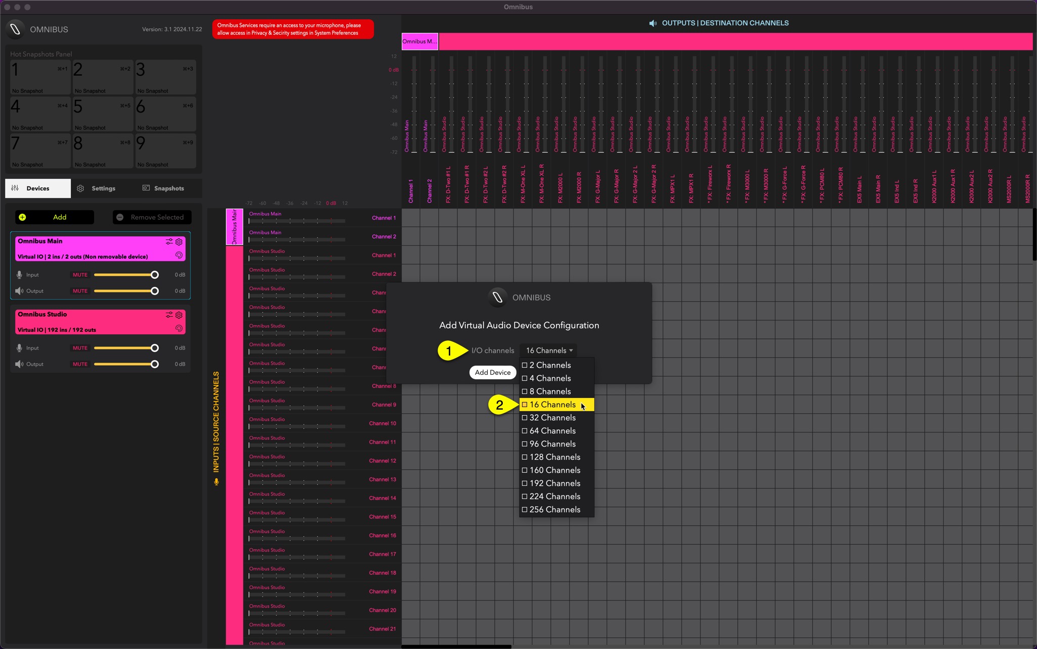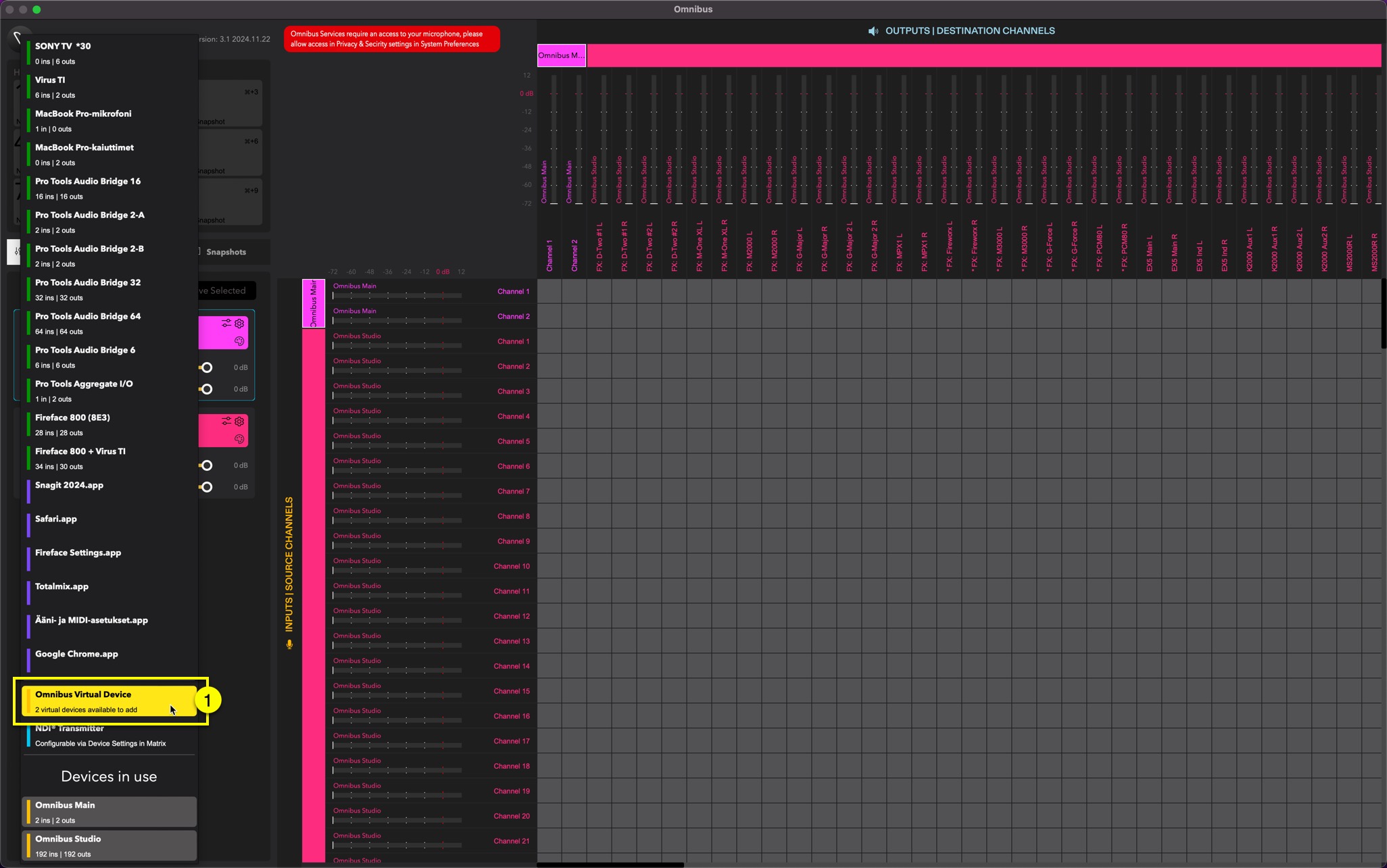 This will open a popup menu showing all Audio Devices connected and Applications available for routing. In our example, we are going to add Omnibus Virtual Device [1] first.