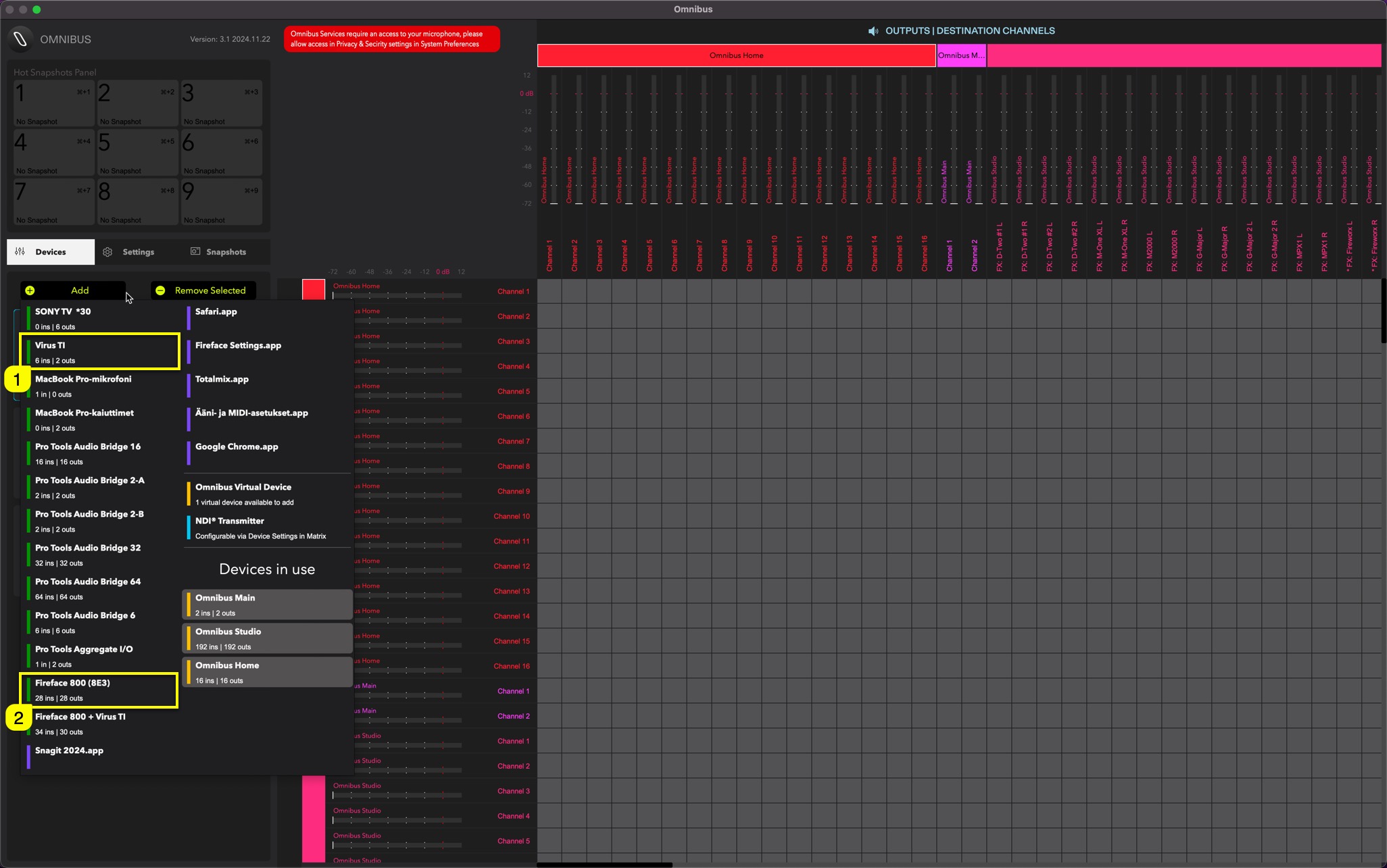 I have Access Virus TI [1] and RME Fireface 800 [2] connected to my mac, so in this example we are going to add both of the devices to the routing.