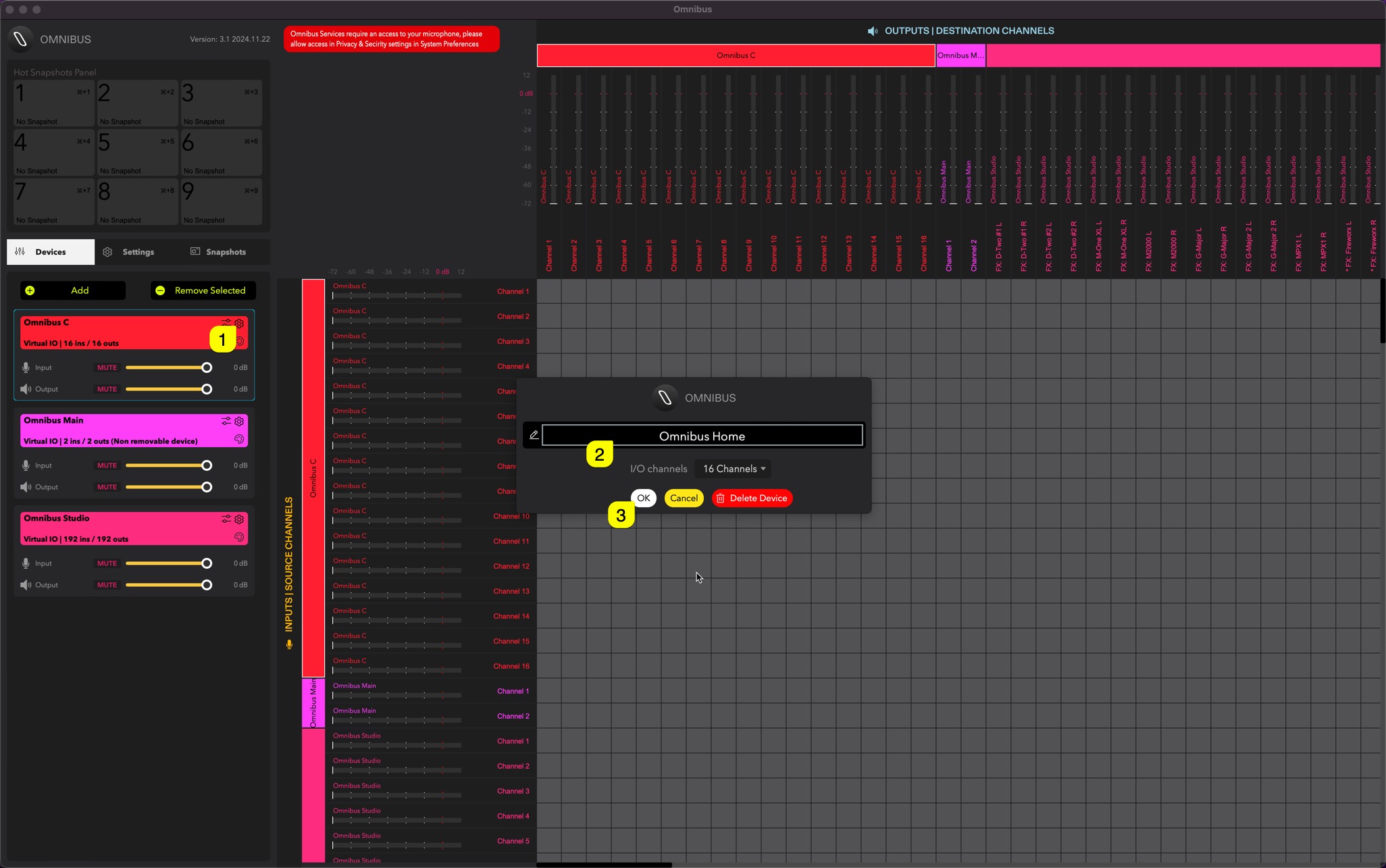 I am going to rename Omnibus C to something different. To do this, click the Gears [1] icon. You can now input a new name [2], adjust number of Channels or delete the device. Click OK [3] once you’re happy.