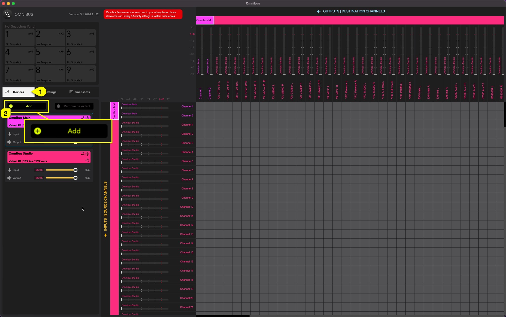 In OMNIBUS window, click Devices [1] tab, and click Add [1] to create a new Virtual Sound device.