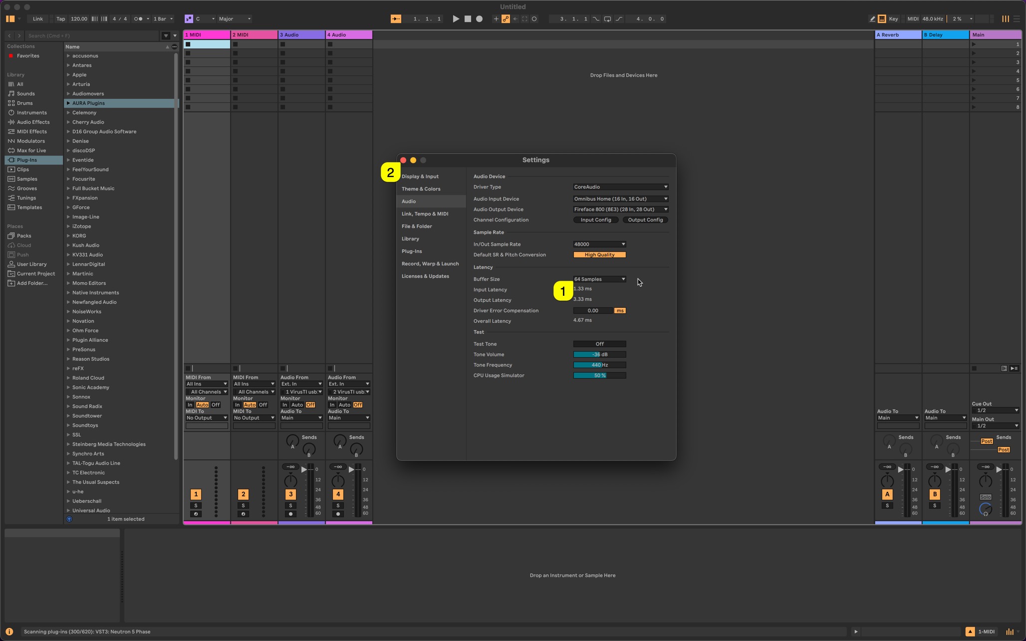Final step before closing the Settings view is to make sure that you adjust your buffer settings [1]. I would personally start with lowest possible value you know your soundcard can handle. I’m setting mine to 64 Samples. Click close [2] toggle once you’re set!