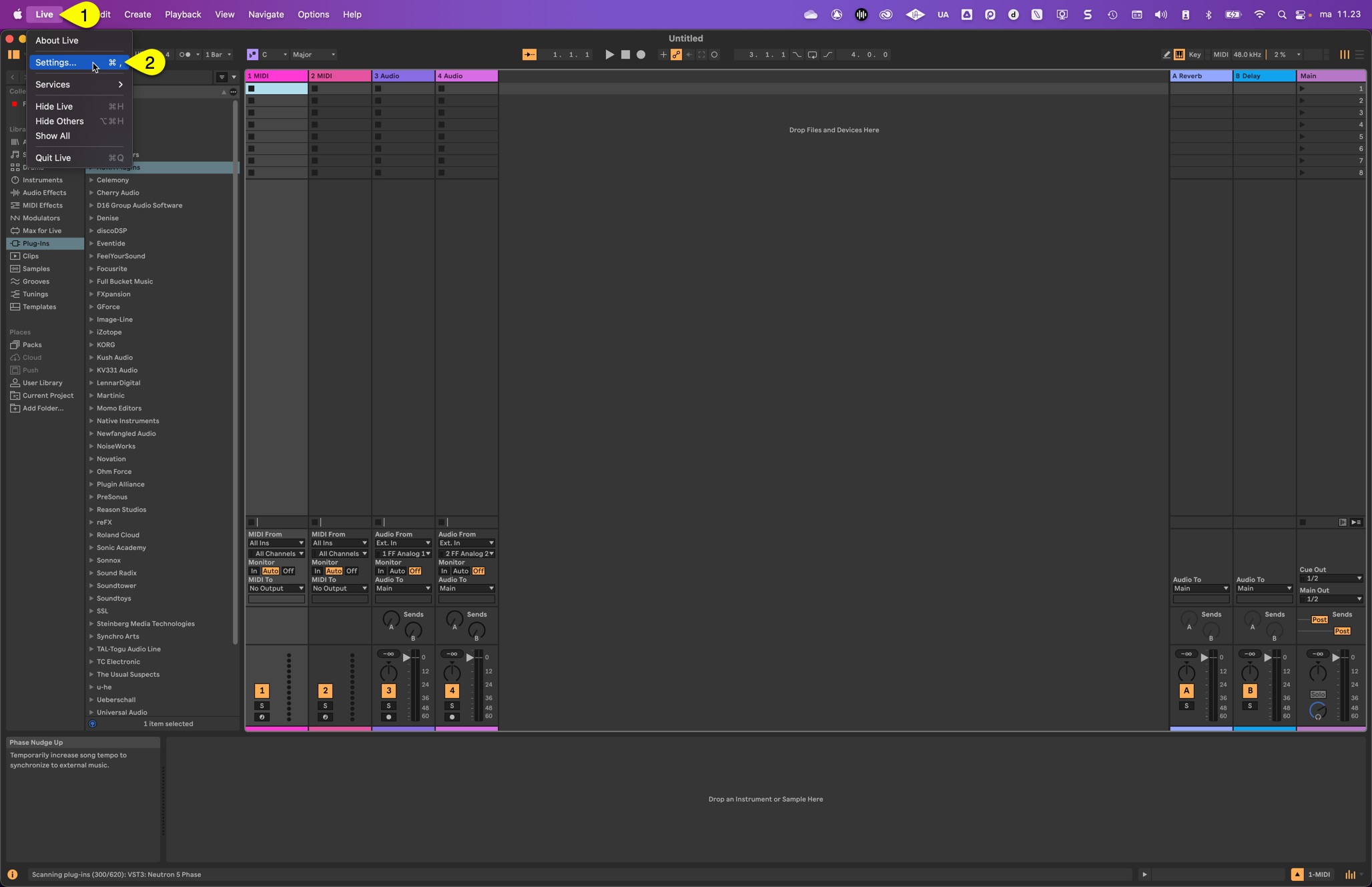 Lets open Ableton Live and set everything up in it. First, click Live [1] menu and open Preferences [2]
