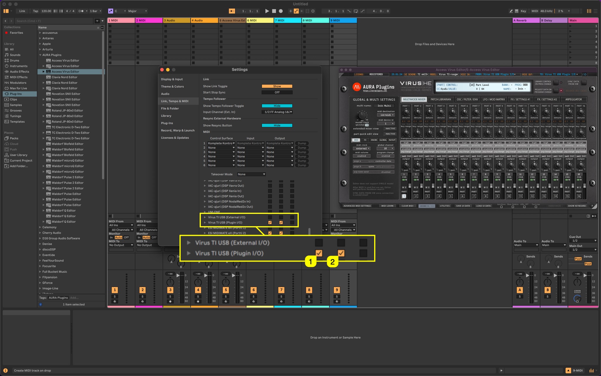 MIDI port configure opens the Settings dialog MIDI settings page. Scroll down the list and Locate Virus TI USB (Plugin I/O). Enable tracking [1] and sync [2] for the port and close the window. Now the port name is visible in Live.