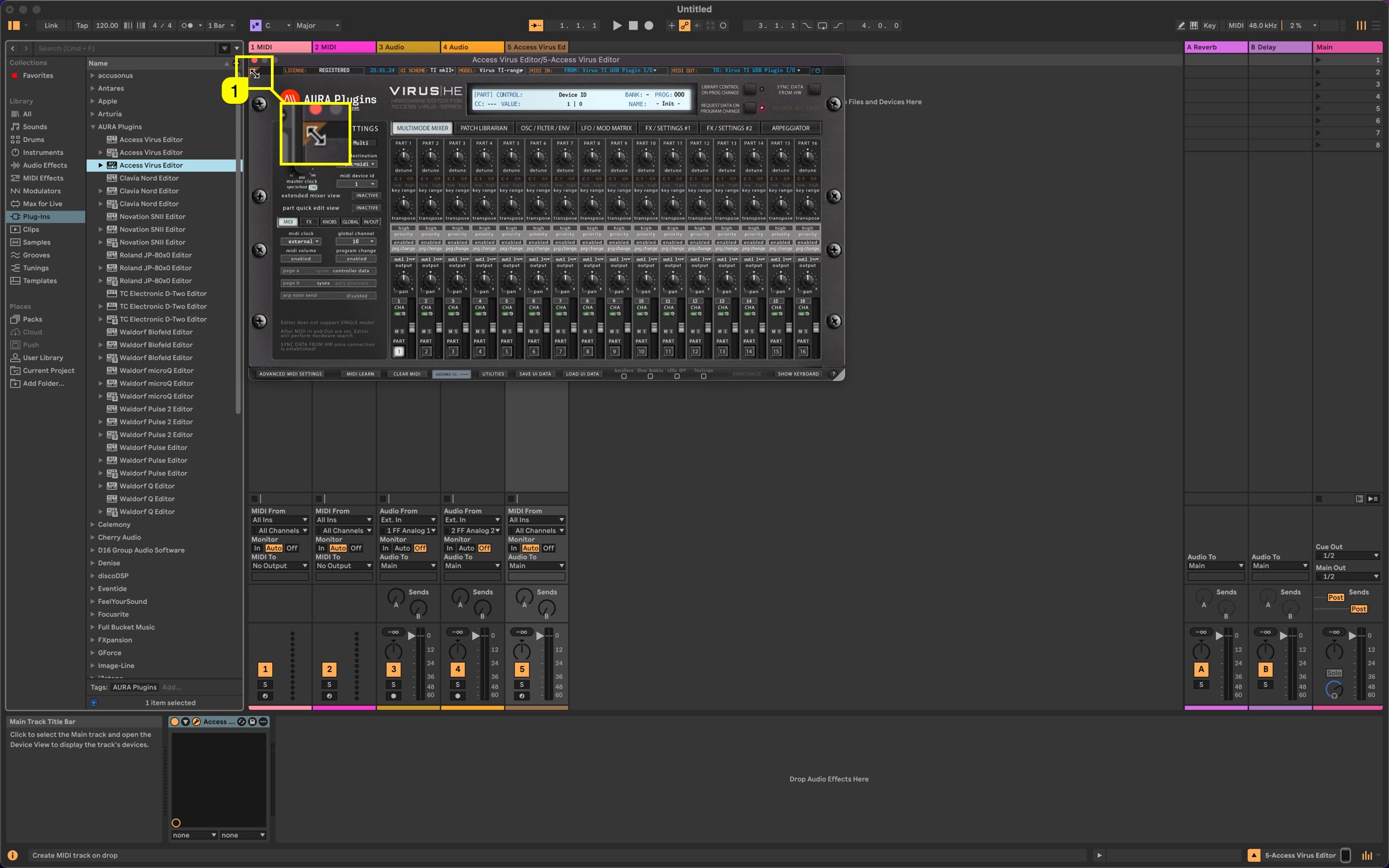 Right click [1] on the Live mixer background and choose Insert MIDI Track or use key command SHIFT + CMD + T. I’ve added 4 tracks for this example – you can add up-to 4 channels with Virus TI Snow and 16 channels with other TI models.