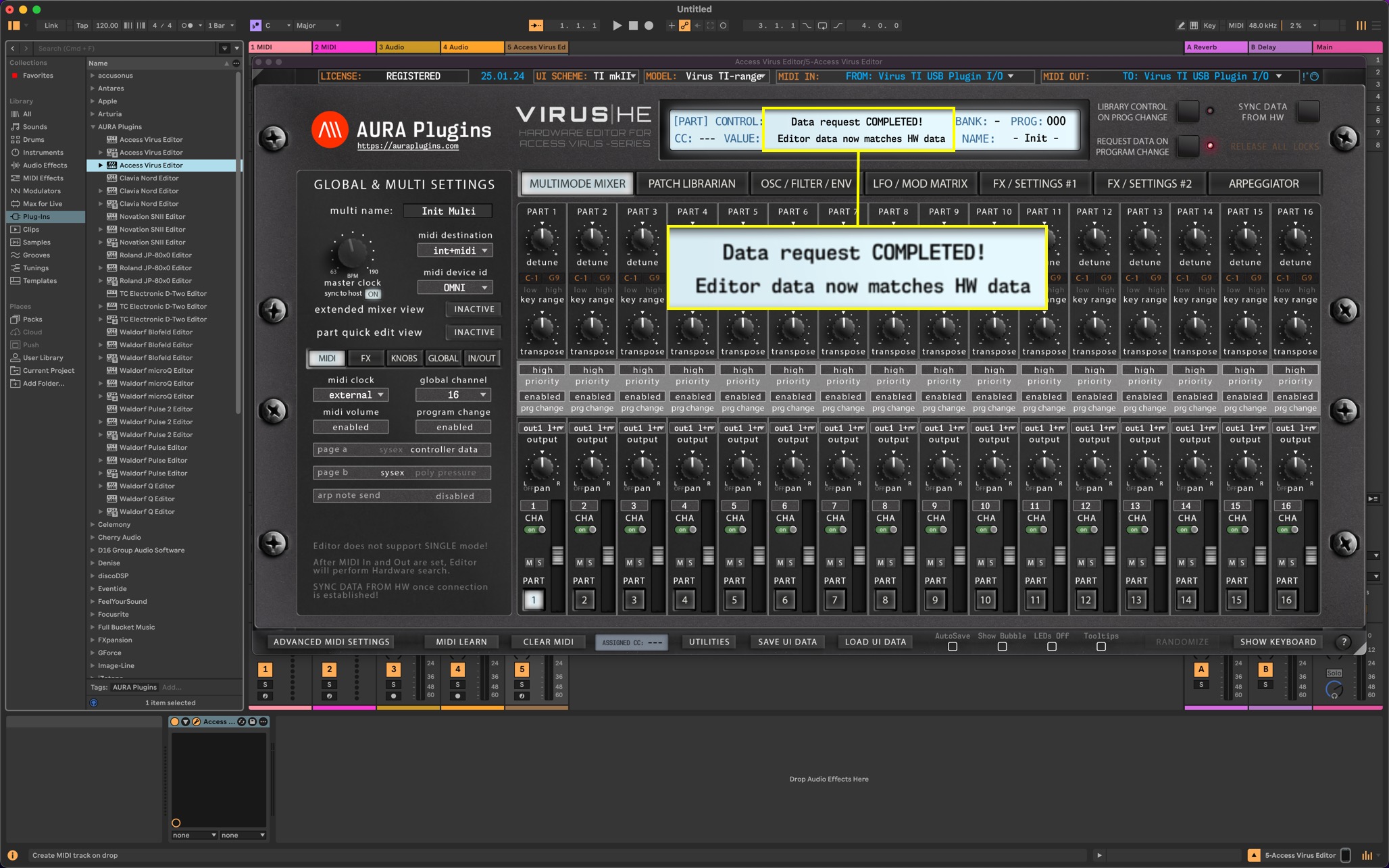 - 6) Editor will start automatic sync with the hardware, getting global settings and parts from the Virus to the Editor User Interface. Wait until it’s done.