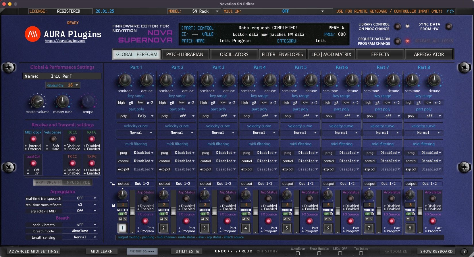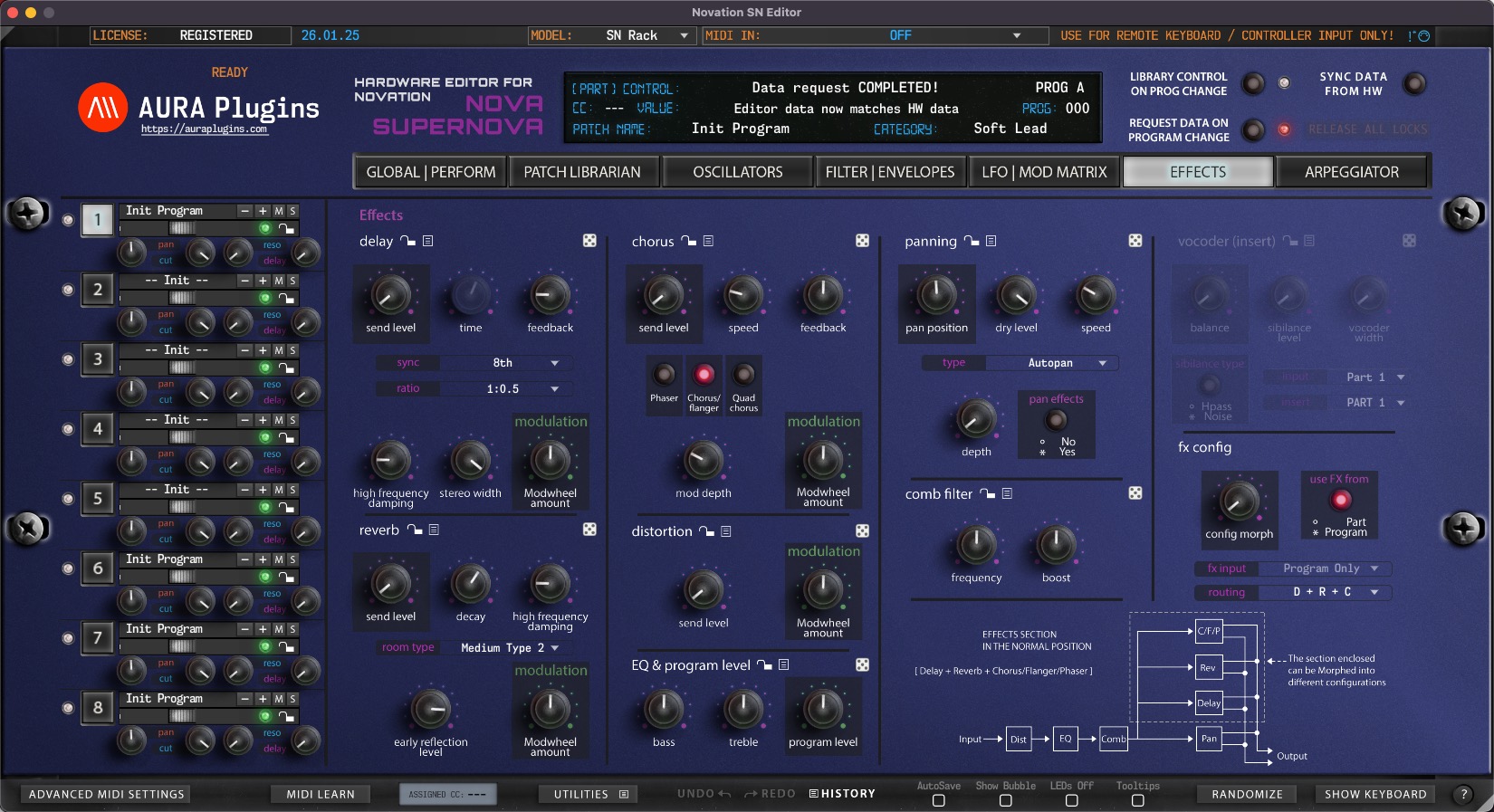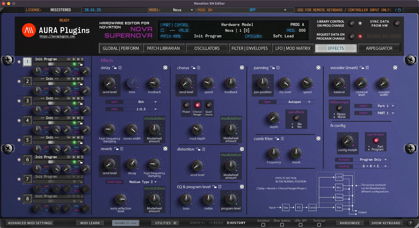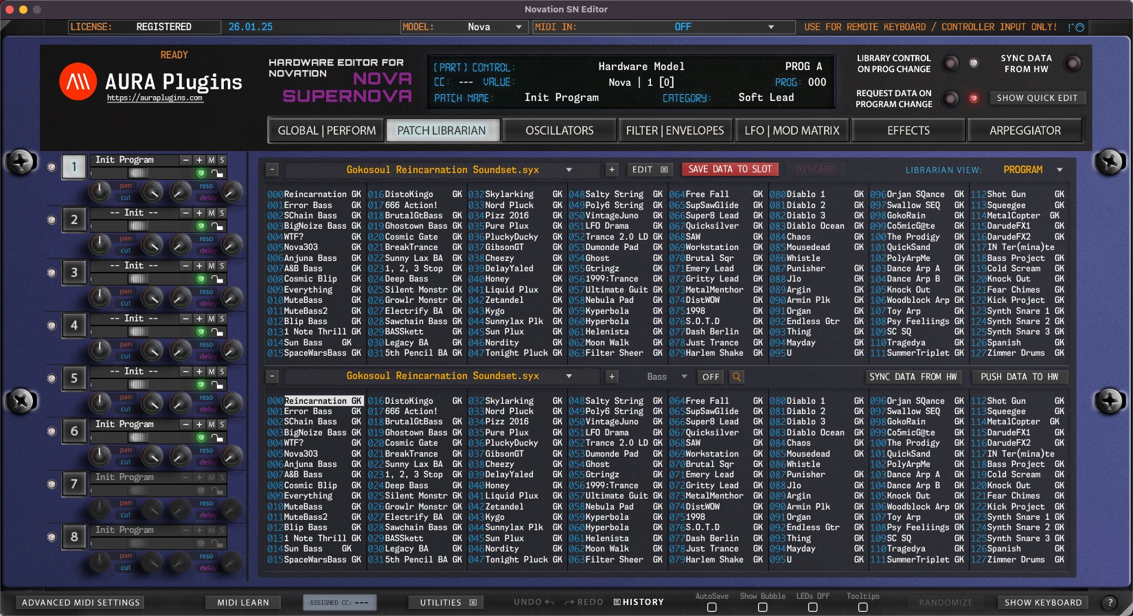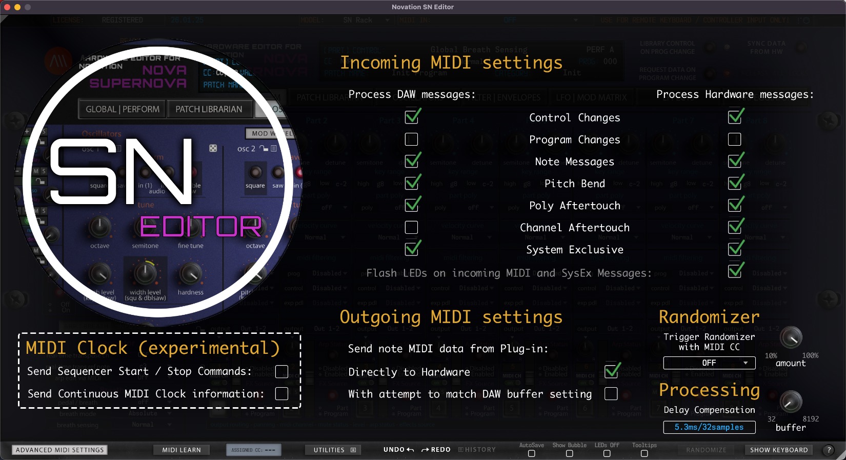 Novation SN Editor & Librarian is designed to control your Novation Nova / Supernova right from your DAW. With our Editor, you can work with your Novation Nova / Supernova Rack by the same way you use your virtual instrument plug-ins. Our Editor will recall your patch settings when you open your project and the data will be sent to your Nova / Supernova automatically once you open your project. Your synthesizer is always synchronized with your session! The only thing you need to worry, is that you power-up your synthesizer.