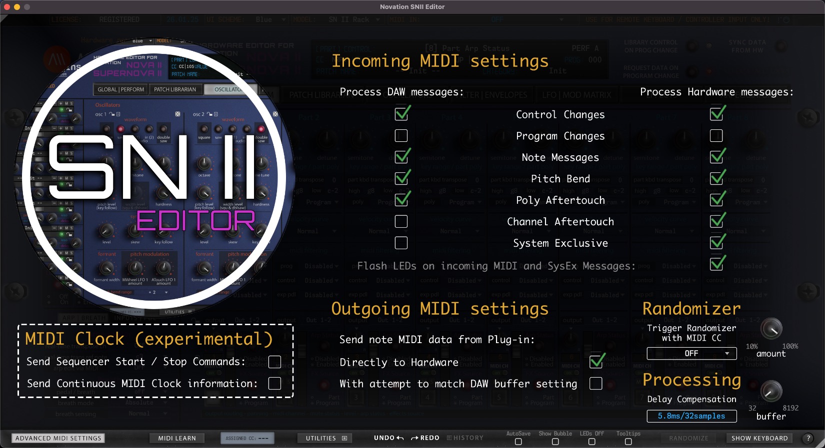 Novation SN II Editor & Librarian is designed to control your Novation Nova II / SN II right from your DAW. With our Editor, you can work with your Novation Nova II / Supernova II Rack or Supernova II Keyboard by the same way you use your virtual instrument plug-ins. Our Editor will recall your patch settings when you open your project and the data will be sent to your Nova II / Supernova II automatically once you open your project. Your synthesizer is always synchronized with your session! The only thing you need to worry, is that you power-up your synthesizer.