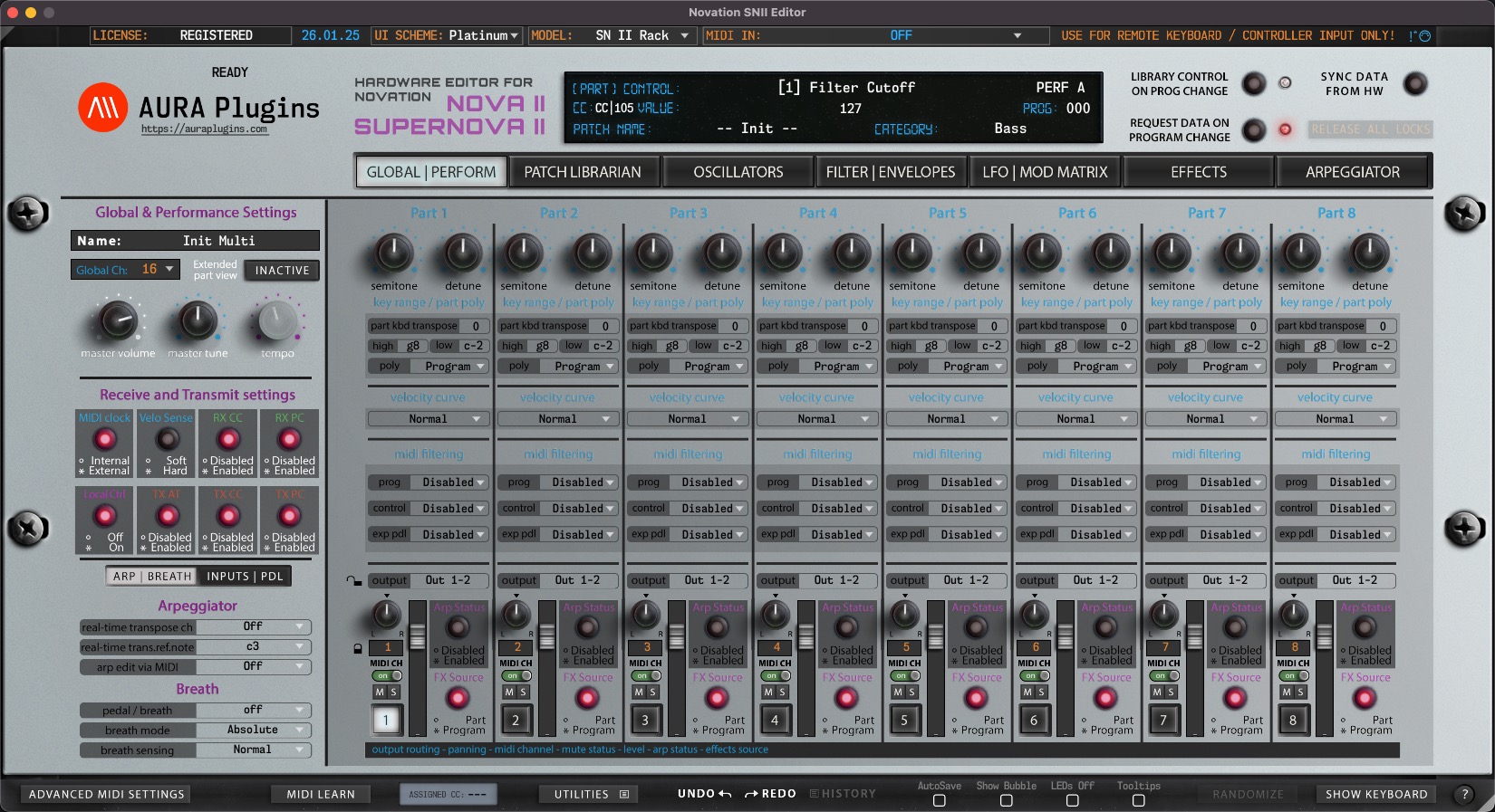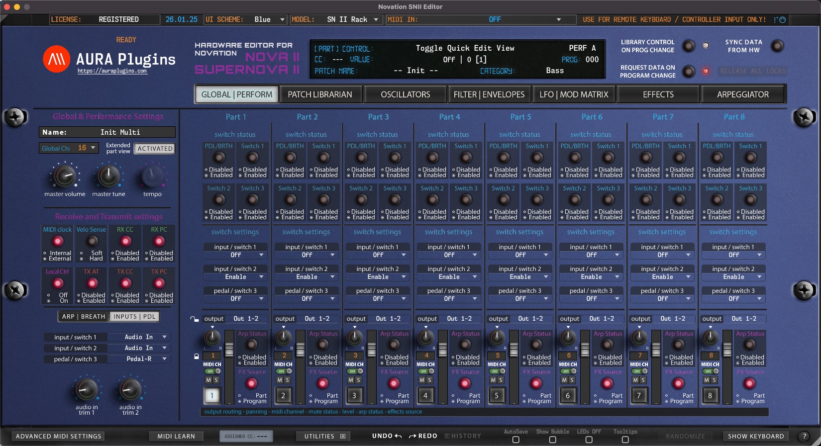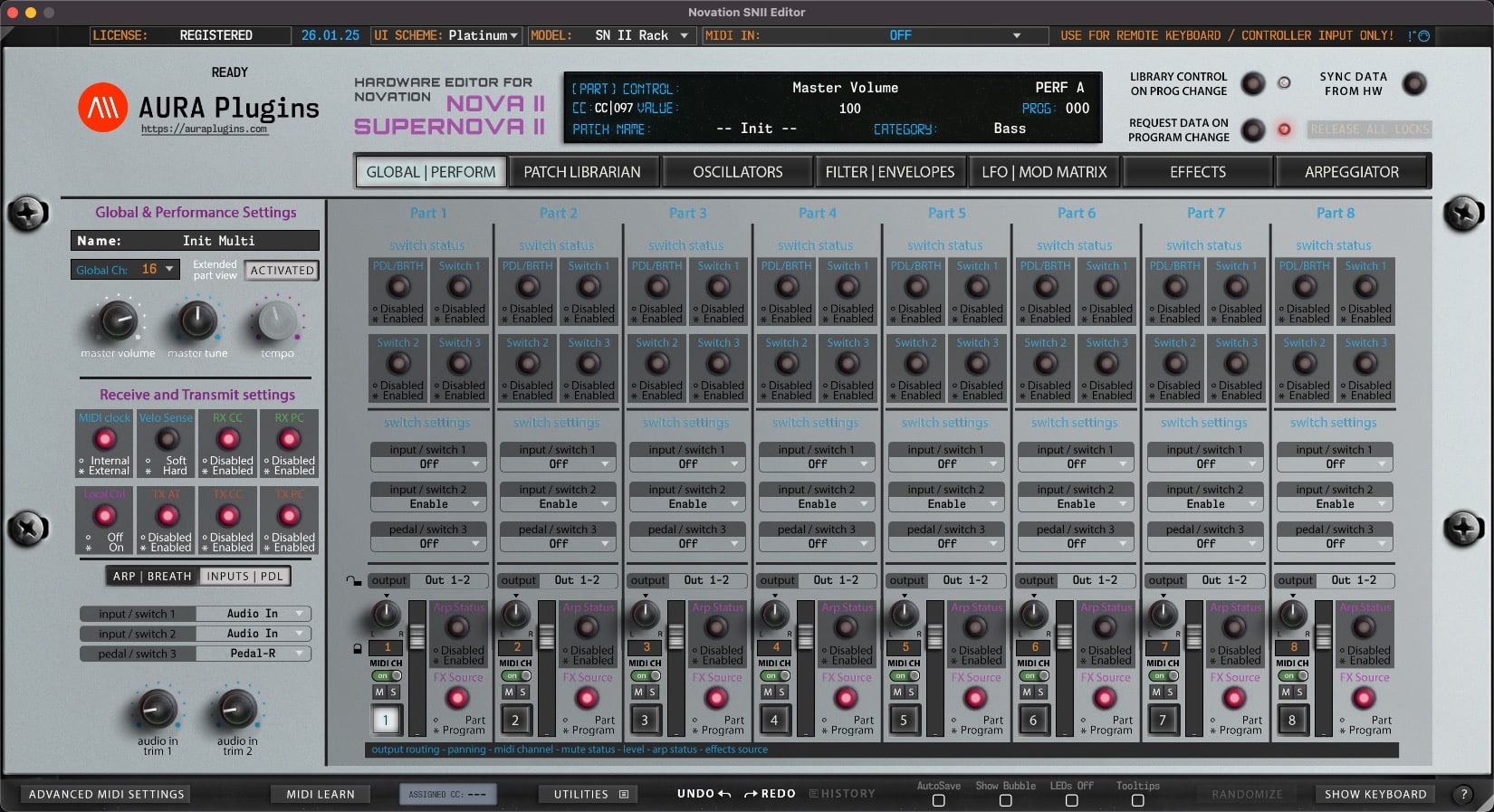 Novation SN II Editor comes with ability to control all 6 / 8 parts from the single plug-in instance. This means, you can have a different patches on different parts and play them at the same time, or individually.